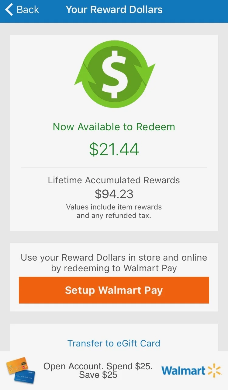 ***It may look like just a little bit of money each time you shop. However, it builds up! As you can see below, I have acquired $94.23 lifetime accumulated rewards. This page pops up when you tap on Your Reward Dollars. I have redeemed some of them and currently have $21.44 to use. This is free money to spend at Walmart! Last time I cashed out, I used it as treat money and bought myself some things that I don't typically buy at Walmart. So fun!