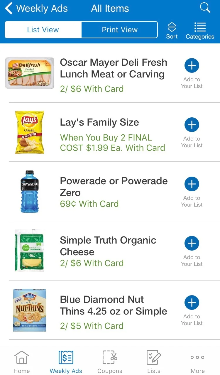 I won't go into too much detail about the Kroger app in case you don't have a Kroger where you live. However, in this day and age, many grocery stores have apps that you can download to get good deals. I know Publix and Winn Dixie have apps where you can view your store's weekly ad and download digital coupons to your cards.