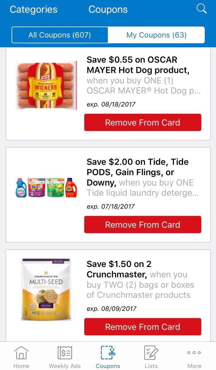 ***And here is the area of the app that helps you save money. You can go through the coupons on the app and load them onto your card. (Where it says Remove from Card below, it usually says Load to Card- unless you have already loaded them onto your card, like I have.) When you load your coupons to your card from your app, you don't have to physically bring any coupons with you. When the cashier swipes your card, these coupons are applied, and it is SO much fun to see your total shoot drastically down!