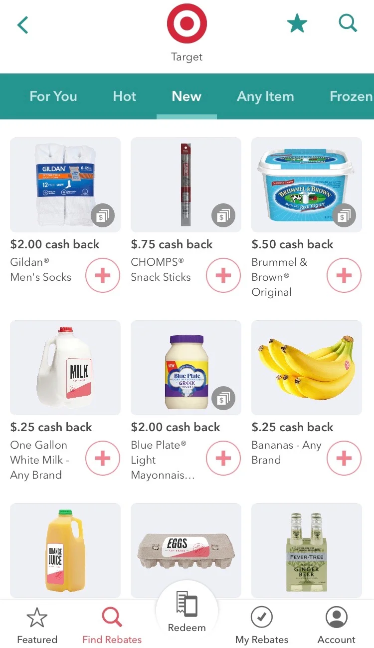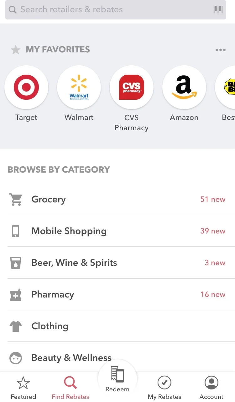 Once you download the app, you choose some stores where you like to shop. I chose Target, Walmart, CVS, Amazon, Best Buy, Uber, Sam's Club, Kroger, and Whole Foods. These places will pop up when you click on the magnifying glass at the bottom of the app that says Find Rebates. BEFORE I go to one of these stores, I go through the rebates they offer.