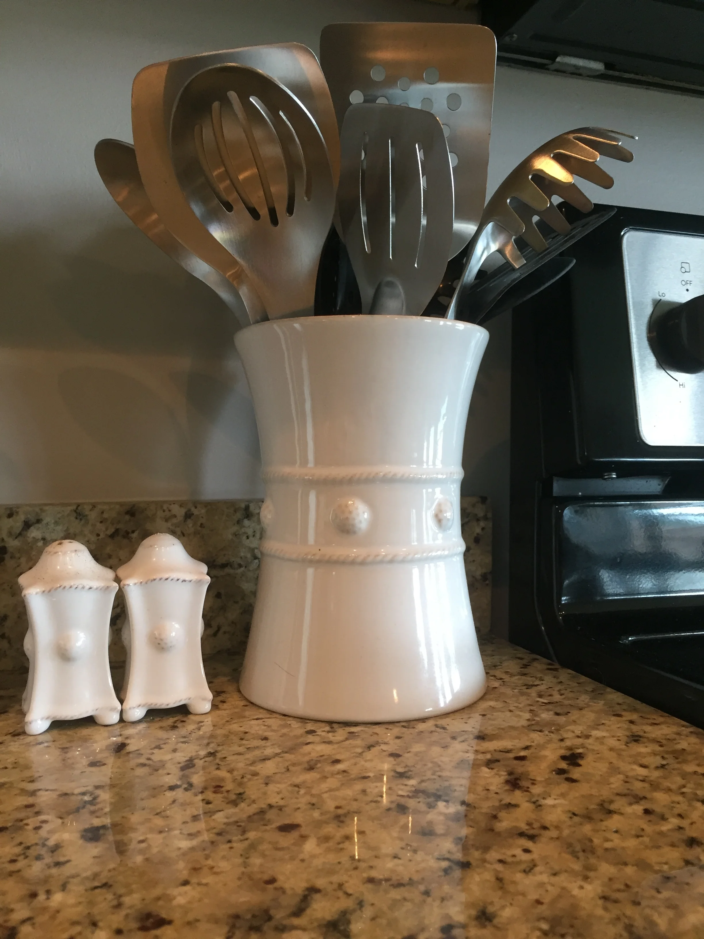 Utensil crock- My friend Sarah gave us this for a wedding gift, and I don't know how I lived without one before. The Juliska website calls it "simply chic housing for your spatulas and spoons." I love how they worded that. Ours sits out on our counter at all times holding spatulas and other utensils. However, it can also be used as a vase or wine cooler, and it's oven, microwave, freezer, and dishwasher safe. Ours was a gift, so it's more than I would have spent, but I'm so grateful to have it! You can find some other options at lower price points here, here, and here.