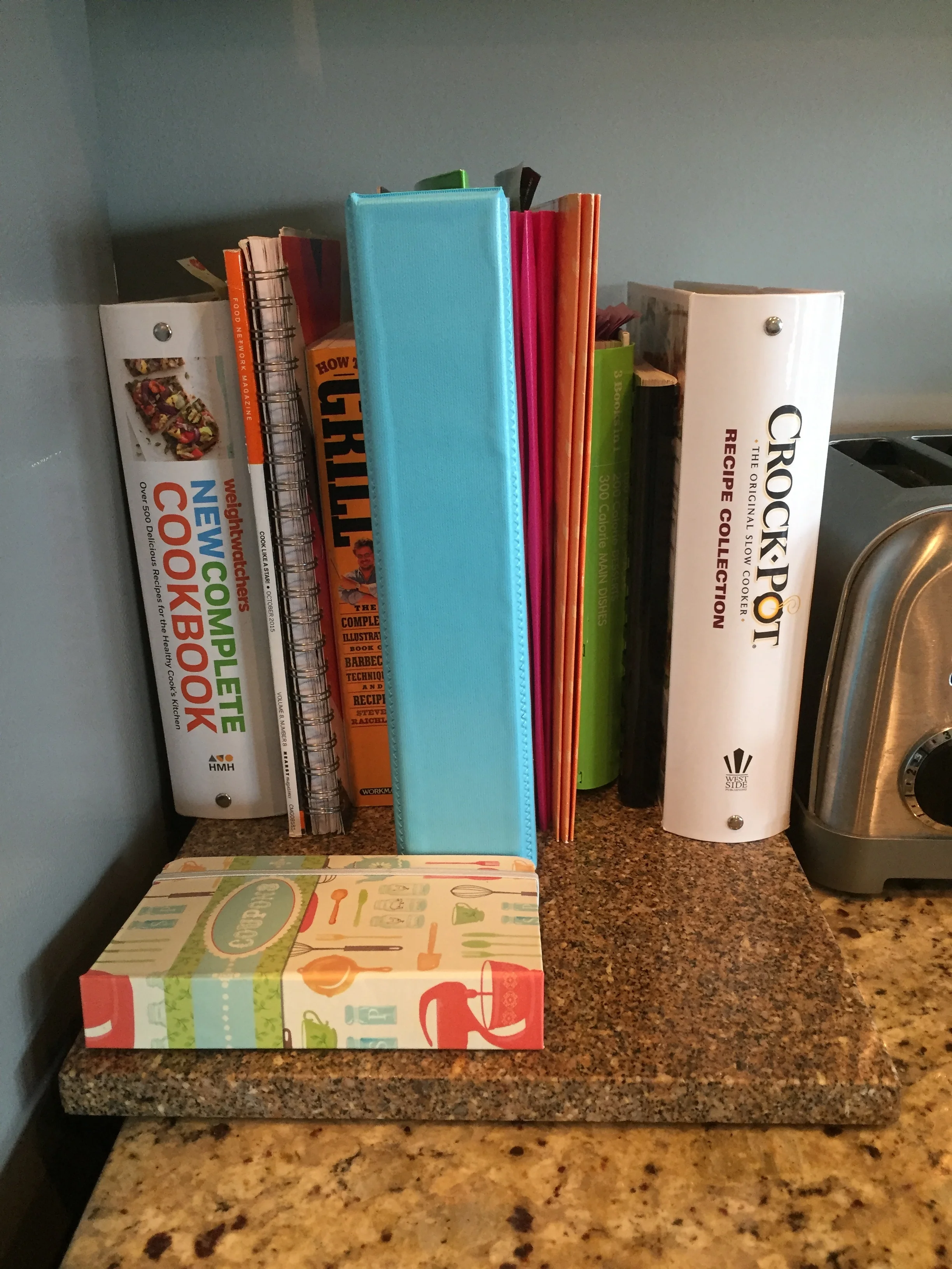Coupon organizer and folder- My sister got me this coupon organizer for Christmas last year because she knows about my love for organization. :) So I keep all of my coupons for the grocery store in the small coupon organizer that Ebie got me. And I bought a bright pink folder recently to keep all of our menus and restaurant coupons that don't fit in the smaller coupon organizer. The blue binder below holds all of the instruction manuals to our kitchen appliances. This small corner of our kitchen may not look as neat and tidy as I would like it to, but it's definitely better than having a cluttered area with coupons scattered everywhere.