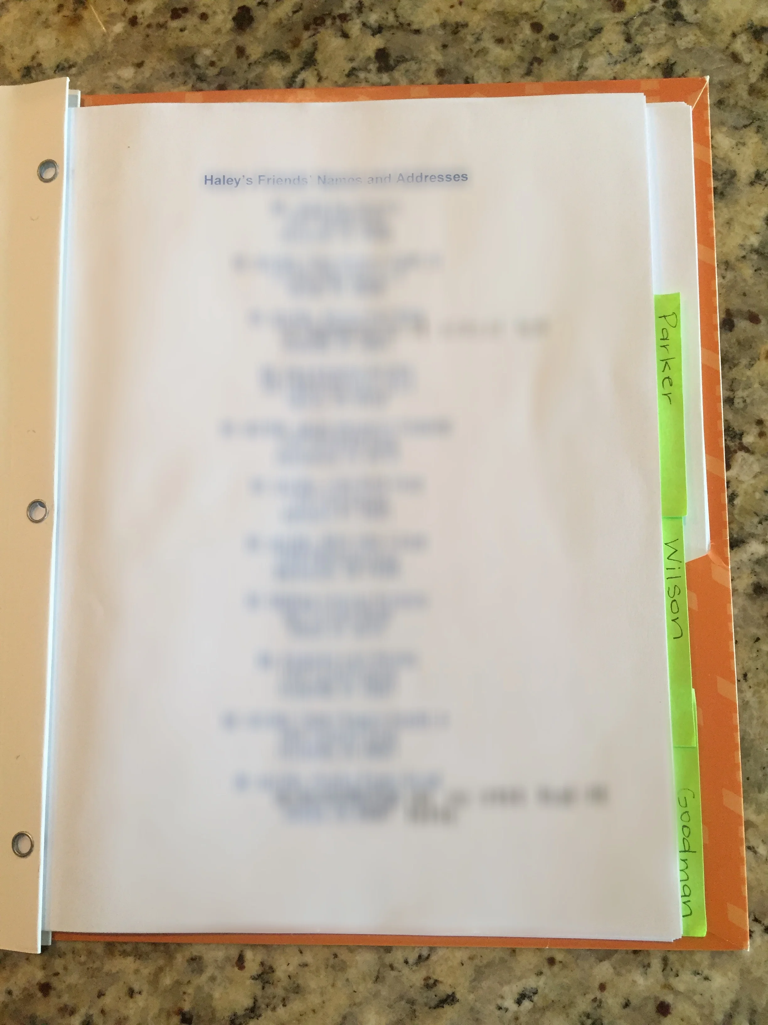 Folder for addresses- When Parker and I got married, we had to collect lots of addresses. So I made a Word document to keep up with all of them, and then I created a folder for them. There's a section for my friends, Parker's friends, my family's friends, and Parker's family's friends. I also made one of these for my mom and Parker's mom. This hard copy is so convenient and comes in handy frequently!